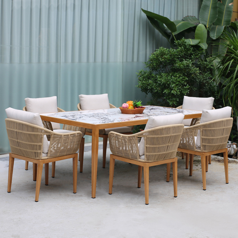 The materials resist UV rays, water, and fading, ensuring the Rope Dining Set maintains its premium appearance over time. The sturdy frame guarantees structural stability even under frequent commercial use.