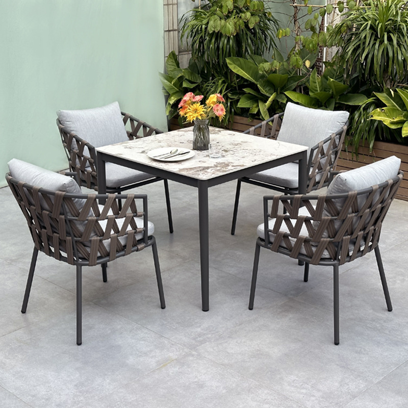Kury designs this rope garden dining set for commercial and residential outdoor dining spaces, including hotel terraces, resorts, patios, gardens, and private villas. The set features a durable powder-coated aluminum frame combined with high-quality outdoor rope surfaces, offering strength, stability, and excellent weather resistance.
