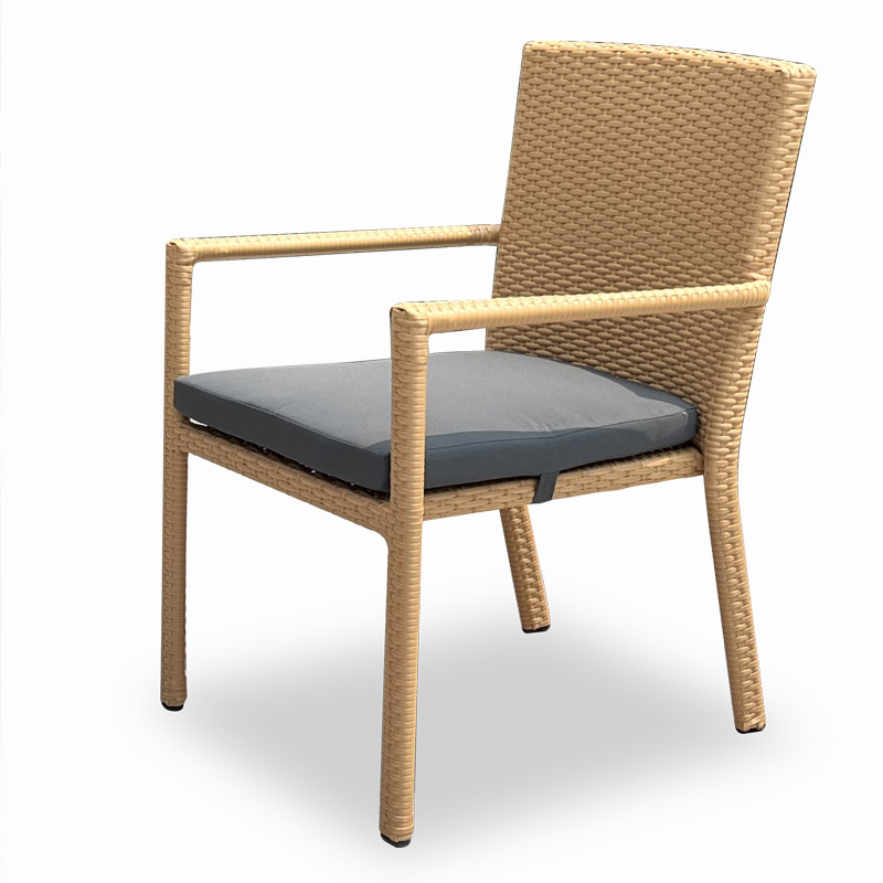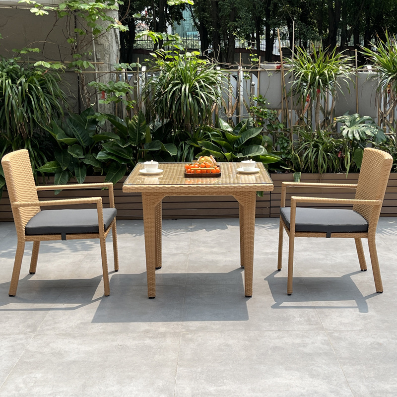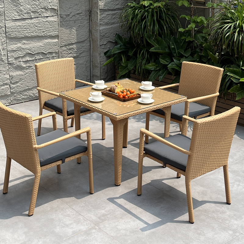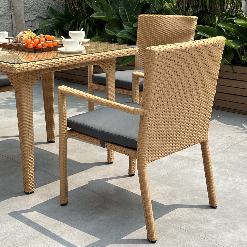 Kury constructs this rattan dining set using high-quality PE rattan and a powder-coated aluminum frame. Moreover, the sturdy frames provide reliable support, letting businesses arrange chairs and tables confidently in outdoor areas.